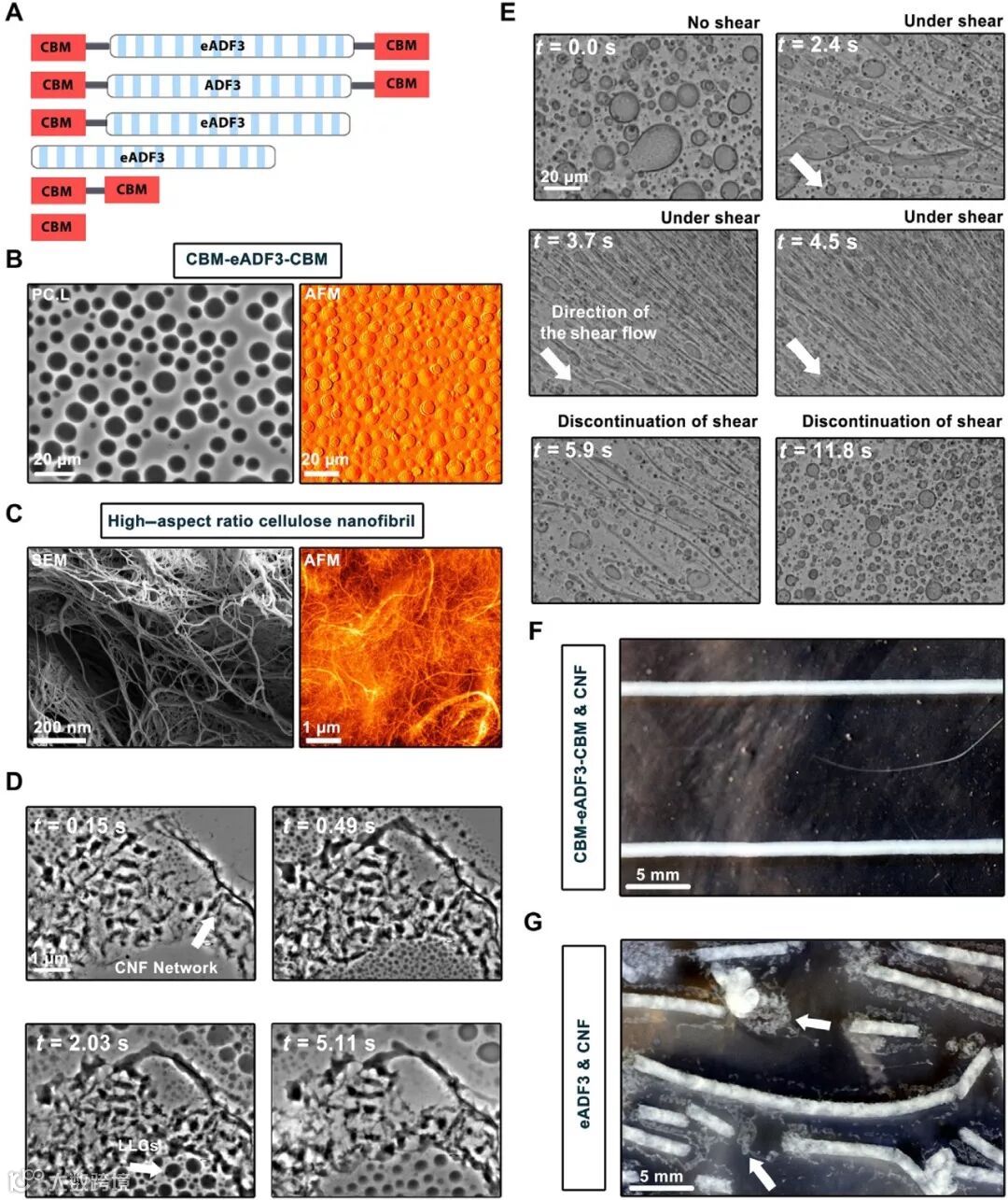 图1. 蛋白质设计,相分离的实现和复合纤维形成。图(A)是末端修饰了CBM基团的三嵌段蛛丝蛋白示意图。蛛丝蛋白序列(eADF3和ADF3)末端修饰CBM。(B)相差光学显微镜和相原子力显微镜表征的液-液分离团聚体。(C)扫描电子显微镜和高度原子力显微镜图像显示的高长径比的CNF网络。(D)CNF在团聚体基质中渗透不同时间的图像。(E)剪切应力诱导团聚体变形的光学显微镜图像。(F)凝固浴中的两根挤出纤维(CBM-ADF3-CBM:CNF,1:2,w:w)。单独使用CNF或任何含有CBM的蛋白质制成的纤维可以制备长达几米的纤维。(G)如果使用单一模块eADF3(缺乏CBM),则所得纤维容易破碎并且不能连续制备。