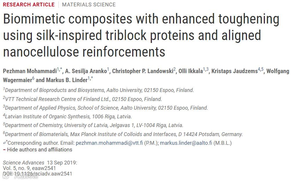 通过生物方法达到相分离从而保持了蛛丝蛋白的β折叠,克服了传统蛛丝蛋白复合材料的矛盾,实现了复合纤维材料的强韧一体化。仅加入约30%的蛛丝蛋白,其拉伸强度达到478MPa,是纯纳米纤维素纤维的1.5倍,断裂韧性是纯纳米纤维素纤维的1.2倍。相关论文以“Biomimetic composites with enhanced toughening using silk-inspired triblockproteins and aligned nanocellulose reinforcements”为题,发表在《Science Advance》上。