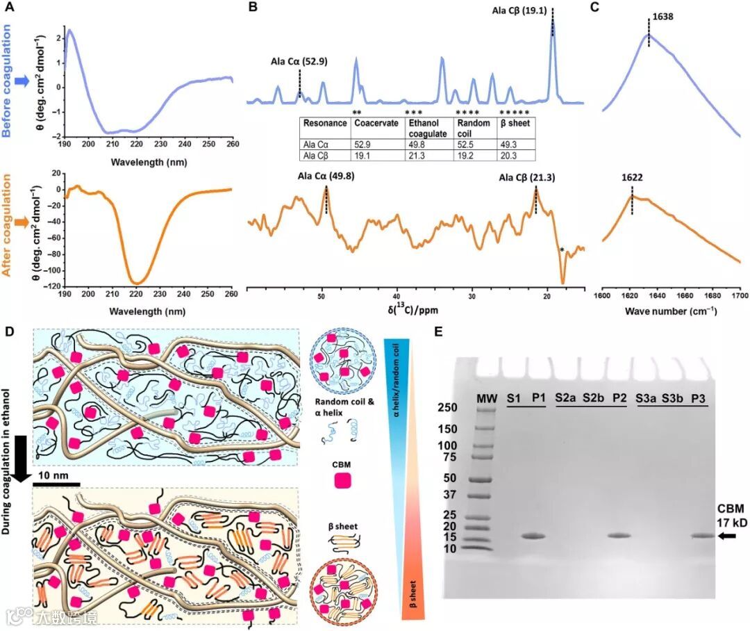 图3. 乙醇对蛋白质构象和CBM与纤维素结合的影响。(A)处于凝聚态的三嵌段蛋白CBM-eADF3-CBM的圆二色光谱(蓝色曲线)和用乙醇凝固后的圆二色光谱(橙色曲线)。光谱显示出了从无规卷曲或α螺旋到高度β折叠的转变。(B)凝聚态(蓝色曲线)和乙醇凝固后(橙色曲线)CBM-eADF3-CBM的核磁共振碳谱(脂肪族部分)对比图。(C)CBM-eADF3-CBM凝聚层的衰减全反射(ATR)-FTIR光谱,显示在凝聚态中出现的1638cm-1处的酰胺键(蓝色曲线),并且在凝固和干燥后,该峰移动至1622cm-1(橙色曲线)。(D)卡通图解释了红外光谱中酰胺键的位移是由于CBM-eADF3-CBM的构象在凝聚态中的(蓝色曲线)和凝固干燥(橙色曲线)状态下发生了改变。(E)电泳凝胶显示CBM与CNF稳定结合,不会被水或乙醇除去。