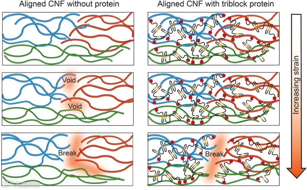 图5. 断口形貌形成机理假说。左边代表没有蛋白质的纤维素纤维,右边、代表以三嵌段蛋白质为基质的纤维。不同颜色的纤维区域凸显出没有蛋白质作为基体材料时,复合纤维的松散状态,在受到应力时,纤维之间形成了大量的空隙,从而导致纤维脆性断裂。而具有三嵌段蛋白作为基体材料的纤维中,三嵌段蛋白对纤维素的粘结性阻碍了裂纹扩展,耗散大量能量,从而使其力学性能提高。