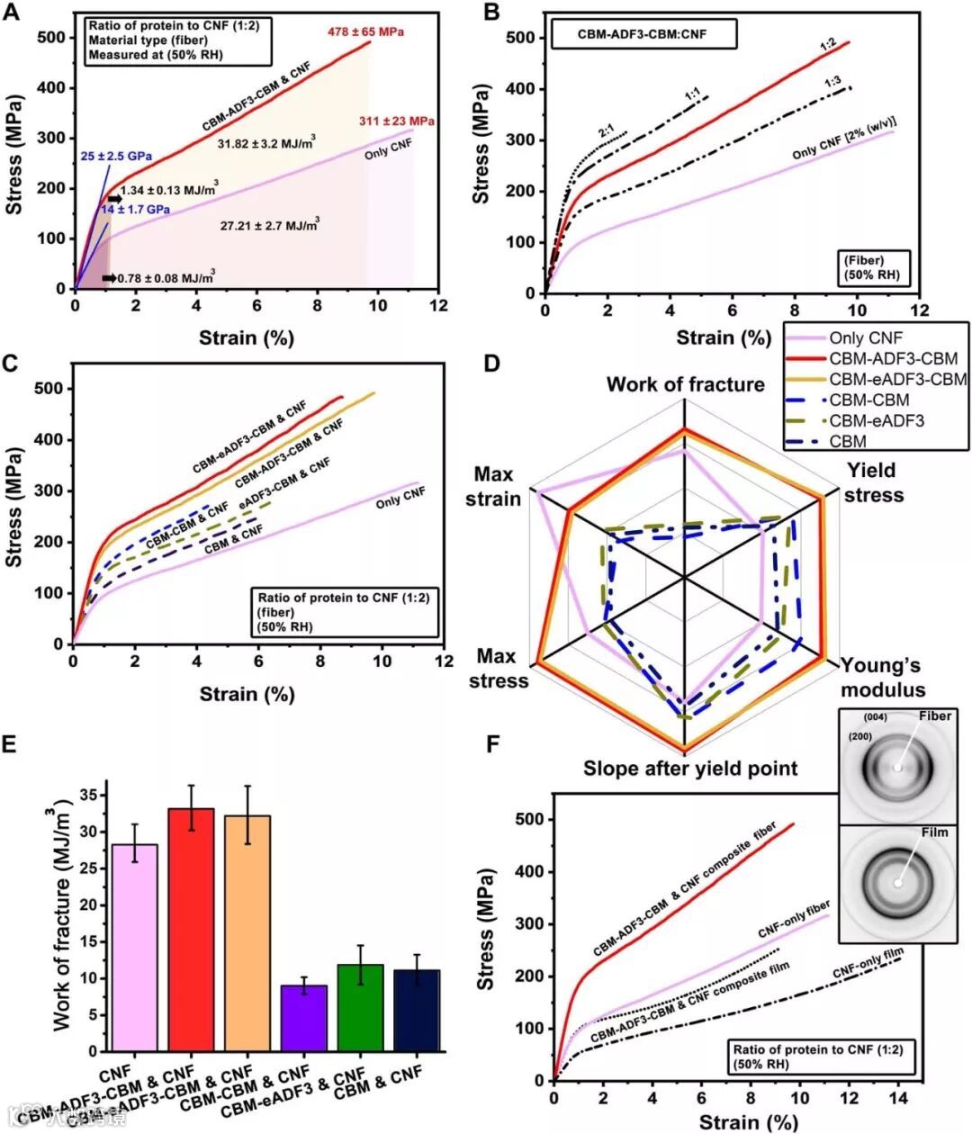 图2. 复合纤维的性能。(A)修饰三嵌段蛛丝蛋白的CNF纤维和其他对比样品应力-应变曲线。(B)以不同蛛丝蛋白与CNF比率制备的复合纤维应力-应变曲线。(C)基于不同蛋白质的复合纤维应力-应变曲线。(D)蜘蛛图表示由基于不同蛋白质制备的复合纤维性能范围。(E)表示复合纤维的韧性值。即(C)中所示的曲线中计算出的断裂功。(F)取向和非取向的CNF复合材料以及纯的CNF应力-应变曲线。