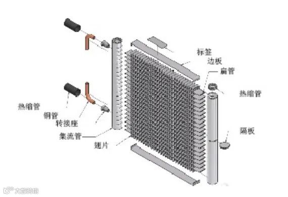 换热器的扁平部分内部装有多条细小的流道,这些流道在扁平管的两侧与圆形的集管连接,而在集管内部安装的隔板则将换热器的流道划分为几个独立的流程(每个流程由若干相互连通的换热单元组成),由于流道内流体流动方向相同,故换热效果较好,能够有效地提高传热性能。