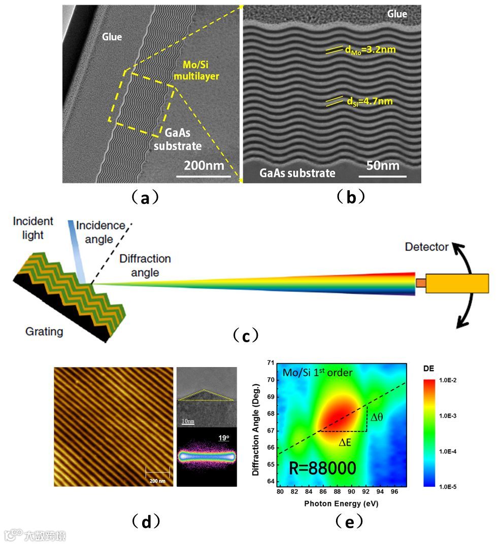 图(a)超高线密度多层膜光栅截面图(b)Mo和Si交替的多层膜结构 (c)同步辐射测算超高线密光栅分光性能示意图(d)反向外延制备20000线/毫米超高线密度光栅结构的AFM图 (e)测算超高线密度光栅器件的能量分辨率高达88000