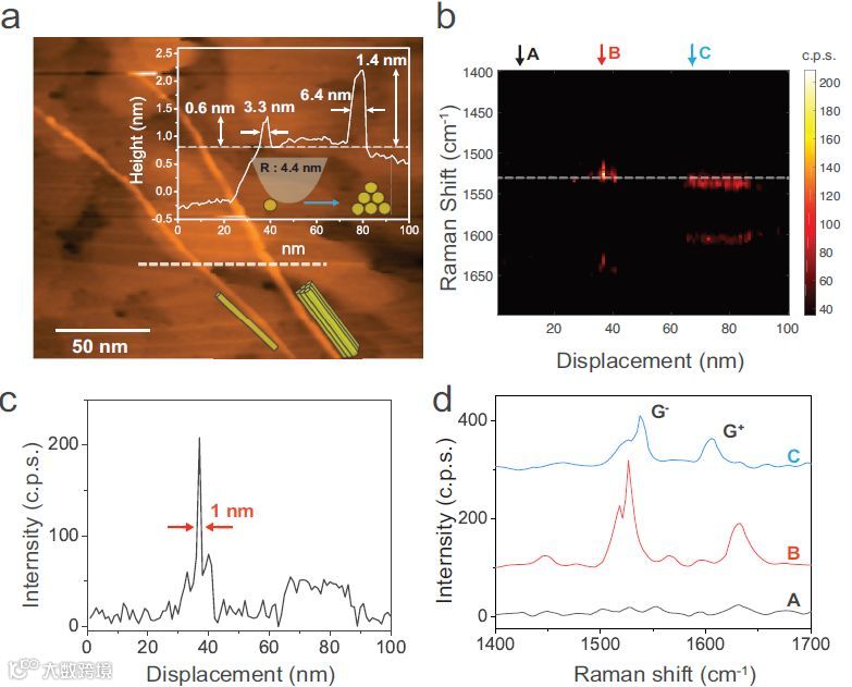 上文展示了高效纳米聚焦技术并证实了光纤银纳米线耦合探针中可选择性激发TM0模。以光纤和尖头银纳米线为基础的扫描探针与普通STM设备构成的TERS无需笨重的光学系统和精密的校准步骤却展示出极高的性能。利用这种简便的设备,作者首次在单壁碳纳米管上进行了无镜头STM-NSOM-TERS实验,达到了1 nm的空间分辨率。