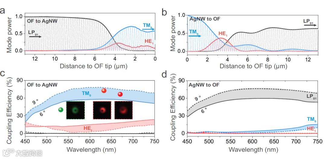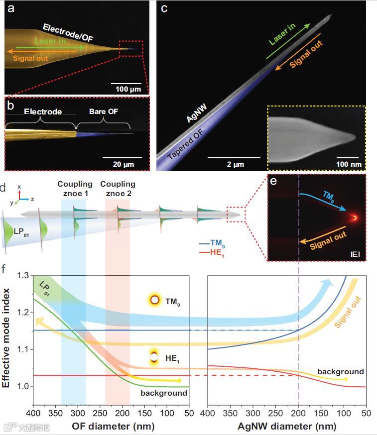 高效率纳米聚焦的基础是选择性高效激发径向偏振的表面等离子模式(surface plasmon polariton, TM0 mode)。因为相较于其他高阶模尤其是HE1 SPP模,TM0模没有截断直径的限制,所以可以被有效汇聚到银纳米线尖端。为实现选择性激发TM0模,本文采用了对不同阶的模分段耦合的方式。如图1d,f所示,线偏振光(p-LP01)由光纤导入并向渐细的光纤端部传导。随着光纤变细,有效模指数nOF和相常数kOF减小。当nOF接近银纳米线SPP TM0模指数时,大部分的入射光能量由光纤的LP01模转为银纳米线中的TM0 SPP模。当k不匹配时光纤和银纳米线之间的能量隧穿停止,因此由光纤导入的能量被锁在银纳米线TM0模中。图1e揭示了纳米聚焦过程。TM0 SPP模携带大部分的入射光能量被进一步压缩到银纳米线的尖端。通过利用约40°角度的尖头银纳米线,在可见光波长范围内可实现约70%的纳米聚焦效率。