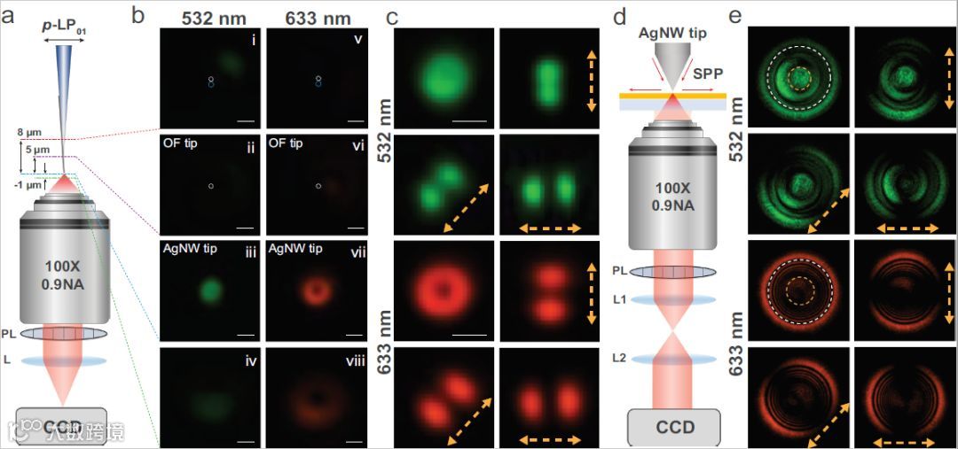 研究团队使用光学显微镜在银纳米线和光纤连接处至银纳米线尖端之间沿着探针轴方向改变聚焦平面的方法验证上述选择性激发TM0模理论的可靠性(图2a)。实验证明在532 nm和633 nm激光激发下,银纳米线与光纤连接处的散射几乎为零,证明了极高的耦合效率。在银纳米线尖端的甜甜圈形的光斑成功证实选择性激发TM0模。随后k空间成像(图2e)进一步证实了在532 nm和633nm波长激光激发下,银纳米线尖端TM0 模占主导地位。