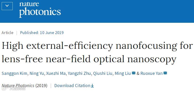 Kim,S., Yu, N., Ma, X., Zhu, Y., Liu, Q., Liu, M.* & Yan, R.* Highexternal-efficiency nanofocusing for lens-free near-field optical nanoscopy.Nature Photonics, 2019.