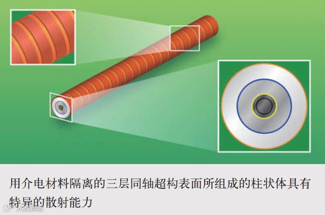 陈红胜和张柏乐的团队在微波波段的两个频率上展示了特异散射。他们设计了一种直径为35.96 nm的柱形特异散射体,由三个同心的超构表面圆桶组成,之间用介电材料相互隔离。每个超构表面是由周期性的铜条构成,其周期和厚度均远小于波长(见图)。根据有效介质理论,超构表面的作用相当于一种介电常数极大的超薄层,这个薄层将表面波限制在微波波段。这种表面波是横波(TE)。调整铜条的周期和宽度来优化超构表面的形状,超构表面支持多重表面简并的TE模,即所有这些模的谐振频率相同。他们设计的散射体的偶极模式和四级模式工作频率为2.2 GHz和3.73 GHz。 进 一步,这种散射体的表面电导使得耗散功率进一步下降。