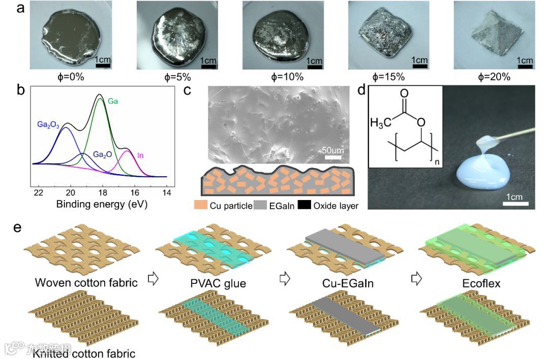 图2 液态金属智能服装的制备方法。(a)掺杂不同比例铜粉的Cu-EGaIn浆料;(b-c) Cu-EGaIn浆料的表面成分和微观形貌;(d) 未固化成膜的聚乙酸乙烯酯(PVAC)胶;(e) 液态金属电路分别在针织棉布和梭织棉布上的制备流程。