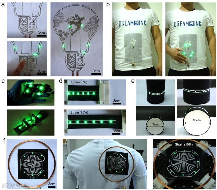 图3 (a-b)液态金属交互式智能服装电路;(c-e)液态金属可拉伸LED服装电路;(f)液态金属无线供电服装电路。