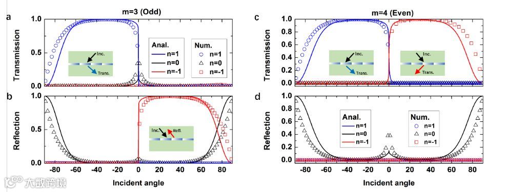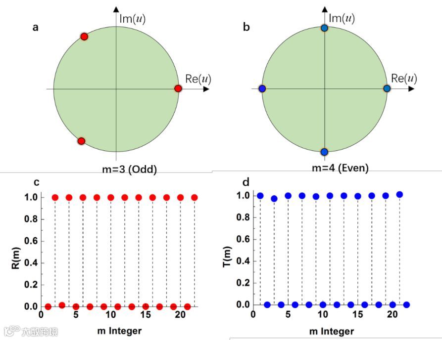 图5. 理论解析揭示奇偶性反转的鲁棒性。当m为奇数时,全部透射。当m为偶数时,全部反射。