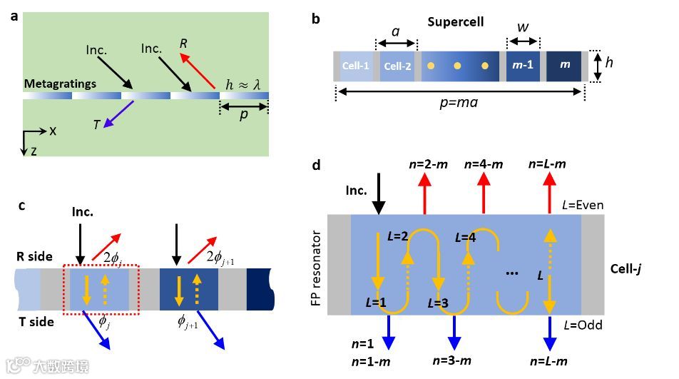 图1. 相位渐变超构光栅的结构示意图和多重反射次数决定的异常反射/透射原理。