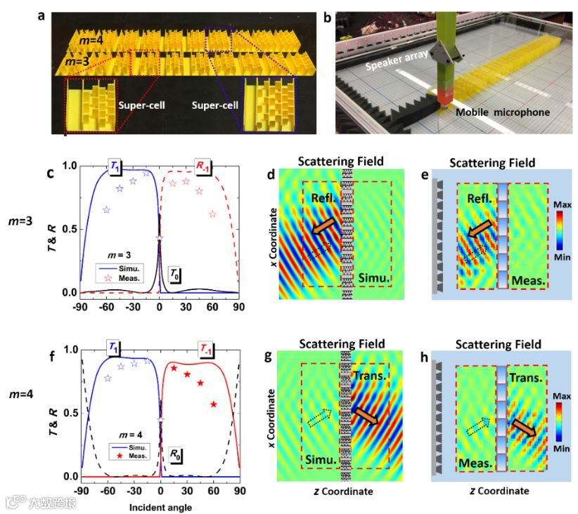 在这个工作中,他们设计了一种声学相位渐变超构光栅(PGM),一个超晶格内包含m个周期单元(m为离散地引入覆盖2π相位的微结构个数)。该结构类似于光学中的亚波长金属光栅。通过研究其衍射特性,发现:当入射波的入射角超过最低衍射级次(n=1)的临界角时,多重反射次数(L)与周期单元个数(m)以及相关衍射级次具有密切关联: