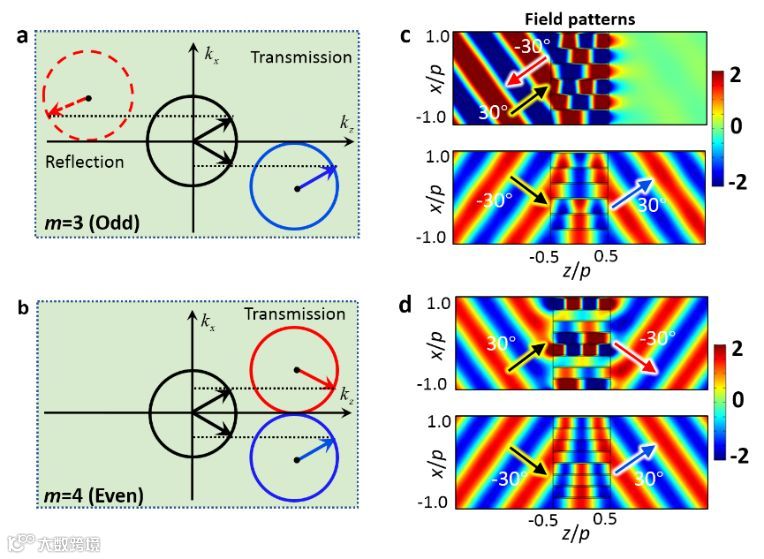,对应高级次n=-1,m=3的超构光栅表现为异常反射,但是m=4的超构光栅表现为异常透射。这就是由于m奇偶性变化导致多重反射次数L奇偶性变化,从而实现异常透反射的转换现象。应用耦合模理论,更多的理论分析结果进一步验证公式(3)的正确性。