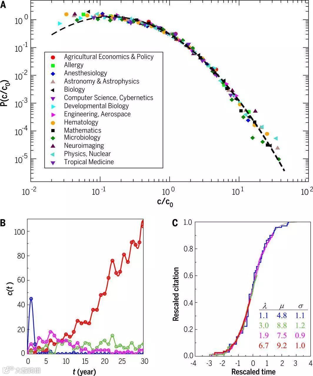 (B)1964年发表于“ 物理评论(Physical Review)”的四篇论文的引文历史,根据其独特的动态选择,显示出“跳跃衰变”模式(蓝色),峰值延迟(紫红),引文数量稳定模式(绿色),和引文指数上升(红色)。(C.单个纸)引文由三个参数确定:fitness λ ,immediacy μ ,和longevity σ 。通过适当的(λ,μ,σ)参数重新调整(B)中每篇论文的引用,四篇论文将其合并为一个通用函数,这对所有学科都是相同的。(77)