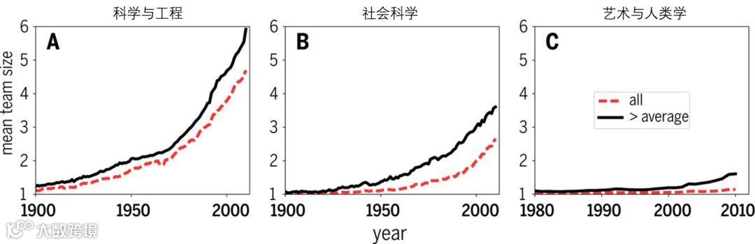 在过去的一个世纪里,平均团队规模一直在稳步扩大。红色虚线表示所有论文中共同作者的平均数; 黑色曲线考虑那些引用数高于领域平均值的文章的团队平均大小。黑色曲线系统地位于红色虚线之上,这意味着大型团队比小型团队更容易产生高影响力的工作。每张图表对应WoS规定的一个学科大类(A)科学与工程,(B)社会科学,(C)艺术与人文科学。