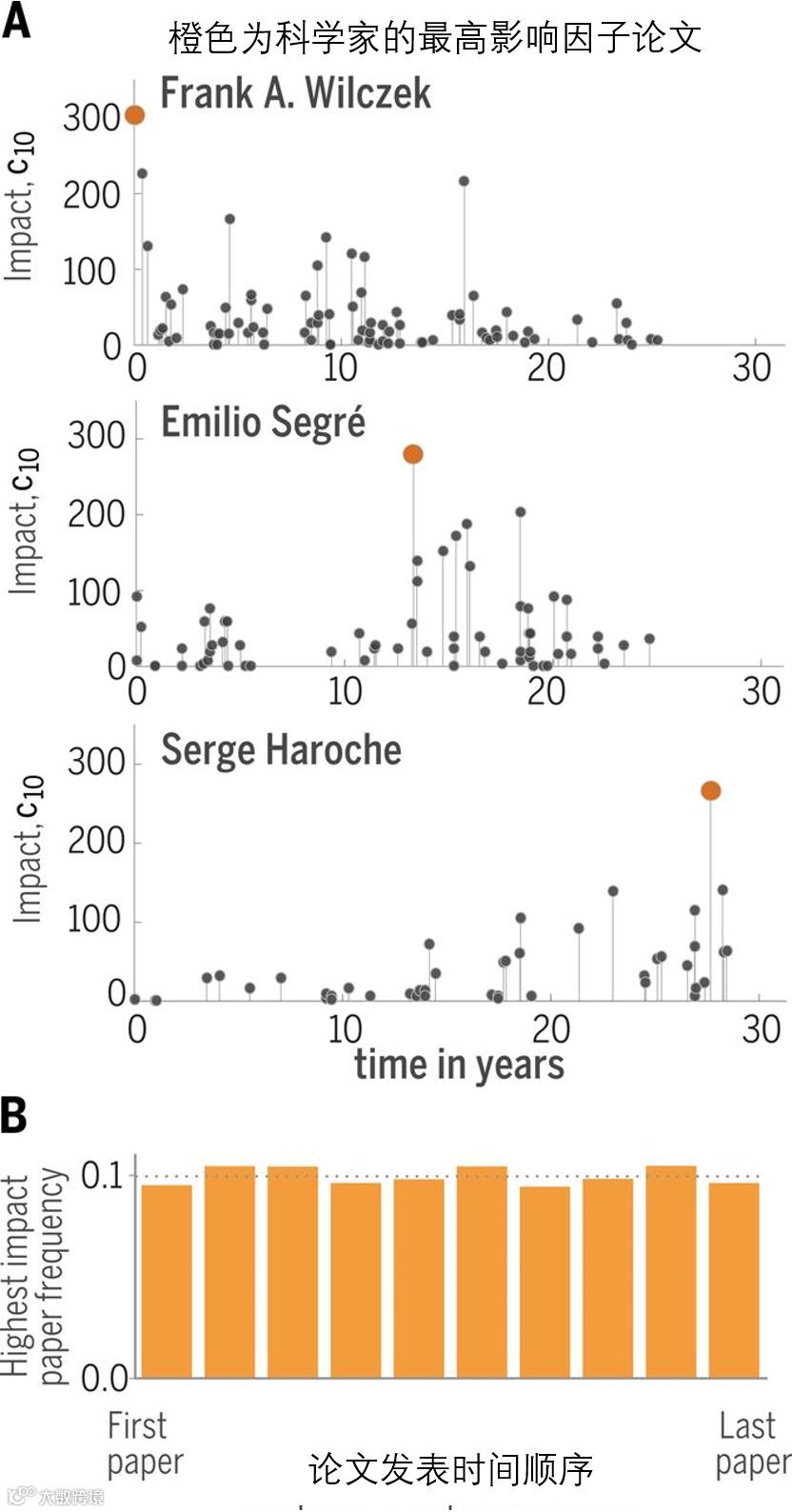 (A)三位诺贝尔物理学奖获得者的发表记录。水平轴表示获奖者首次发表文章后的年数,每个圆圈对应一篇研究论文,圆圈的高度c10代表论文的影响,意为文章10年后的引用次数。获奖者的最高影响论文用橙色圆圈表示。