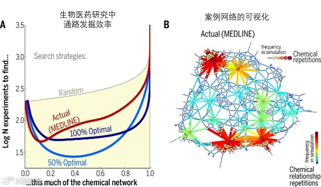 (A.)一项研究衡量了2010年MEDLINE(医学数据库)发表的所有新药物的发现效率。该模型没有考虑特定实验的难度或费用的差异。这个全球科学战略的效率图体现了新发表的生物化学新通路(横轴)与平均实验次数(纵轴)之间的关系。与此对应的,可以制作药物之间的网络图。研究者使用了各种假想的策略效率来与现实情况的策略效率来进行对比,用完全随机,以及50%和100%发现最佳网络的优化策略。纵轴上的较低值表示更有效的策略,进行新发现的模式并不是最优的。实际策略最适合发现13%的化学网络,而50%优化的策略对于发现50%的化学网络有效,但两者都不如揭示整个网络的100%最佳策略一样好。(B)现实中药物发现网络可以被绘制成图表的形式。该策略诞生的新连接是围绕着一些“重要的”、高度相关的化学物质进行的研究,如图中的热点,但是100%效率的研究策略则显示了更加均匀的发现规律,并且不太可能在科学可能性的空间中“从众”。(15)