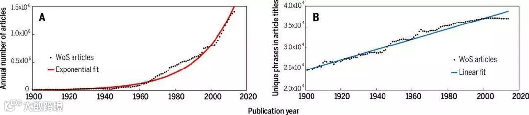 早期研究发现科学文献的数量随着时间呈指数积累(2),平均15年,文献数量就会翻倍(图1)。然而不要因此就以为科学思想就因此跟着文献的数量一起成倍增长了。出版界的技术和经济也随着时间而改善,发表文章制作效率也因此而提高。此外,科学领域的新发表文章往往聚集在不同的知识领域(3)。