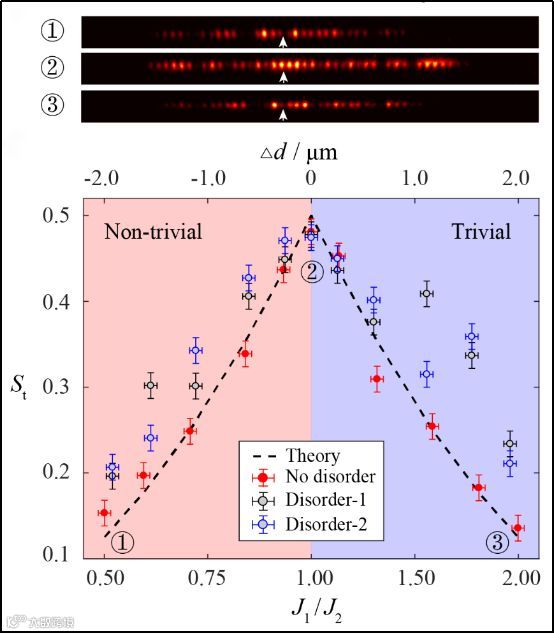 作为相似的方法,研究团队发现拓扑相变信号(TPTS)同样可以通过广义光子群中心观测。在实验验证该过程时,研究人员通过单光子源以及单光子成像技术进一步将该方法推进到量子领域,这为拓扑光子学和量子光学的结合而成的量子拓扑光子学又新增了一个全新工具。研究团队构建了发生拓扑相变过程中的十一个不同结构并测试了单光子在体态演化后的分布,并通过最终分布结果提取了其中的特征信息,进而提取拓扑相变信号,与理论计算结果吻合的很好。该方法的稳健性通过在系统结构的人为地增加了结构噪音得以进一步验证:无论有无人为增加的结构噪音,拓扑相变点的信号都十分明显。