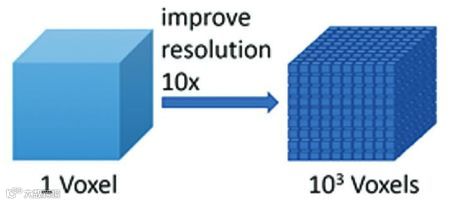 图1:3D打印过程中每次固化的树脂体积元。为了提高精度10倍,所需要的体积元需增长103倍。