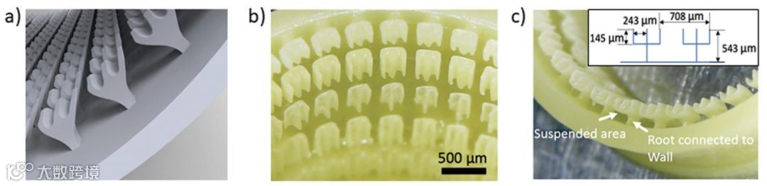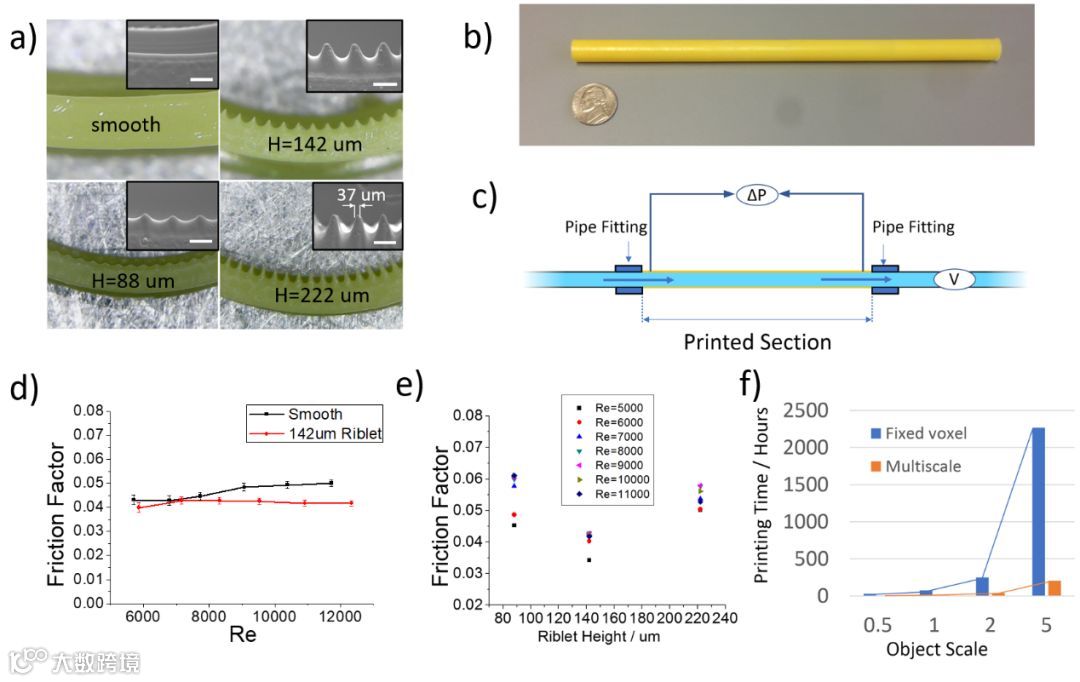 如下图5所示,利用可切换式3D打印机,研究人员打印出了内部具有仿生鲨鱼皮结构的管道,通过流体阻力测试,他们发现无鲨鱼皮结构的光滑管道的摩擦系数为0.046 ∓0.0017,如果加上仿生鲨鱼皮结构,管道的摩擦系数会降到0.042 ∓0.0016,因此能够获得10%的平均减阻效果。研究人员同样测试了不同尺寸的鲨鱼皮结构并且发现高度为142微米的结构具有最理想的减阻效果。具有齿状微结构的复杂结构仿生鲨鱼皮也被成功打印(图6)。
