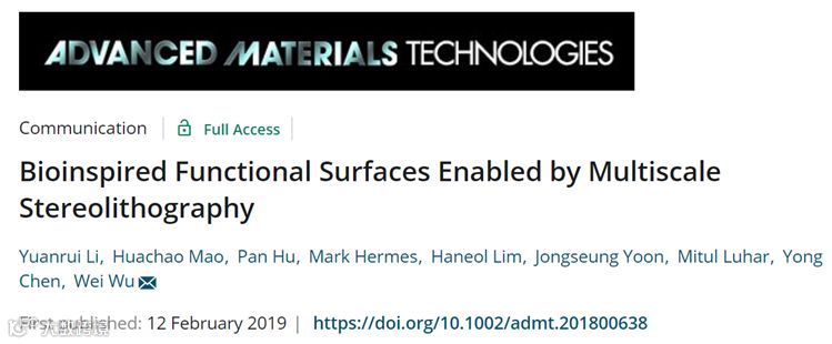 Yuanrui Li, Wei Wu, et al. BioinspiredFunctional Surfaces Enabled by Multiscale Stereolithography. Advanced MaterialsTechnologies, 2019.