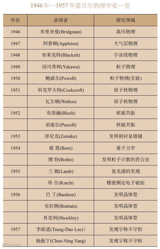 黄昆先生是在二次世界大战刚结束时考取公费到英国留学的。当时国际上对固体物理的研究刚刚开始,这可以从历年的诺贝尔物理学奖获得者的研究领域看出(见表)。从1946 至1957 年诺贝尔物理学奖基本没有授予与固体物理有关的研究,说明当时只有一些个别的针对某一具体问题的固体物理研究,而没有系统的研究。如黄昆先生的导师莫特先生就研究了照相底板曝光过程中的电子过程,并写就专著《离子晶体中的电子过程》。