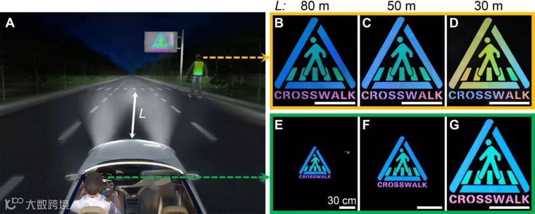 图2.(A)逆反射结构色薄膜制备的交通反光标牌在夜间道路上应用的示意图,以及车辆距离标牌不同距离L时(80米、50米、30米)(B-D)行人视角和(E-G)司机视角的照片。