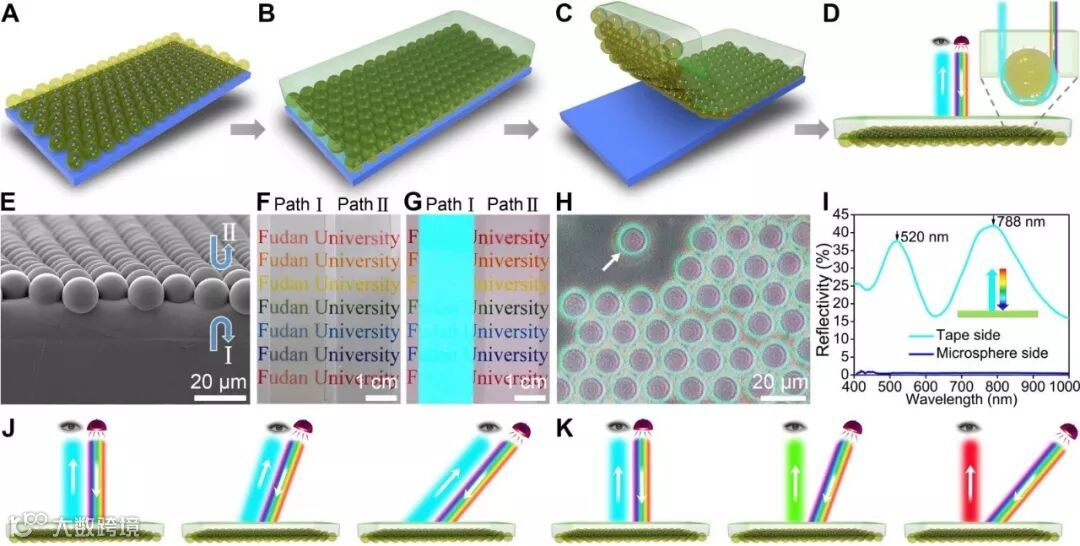 图1. 逆反射结构色薄膜的(A-D)制备步骤, (E-I)结构和光学特性,以及(J)照明/观察同轴时随角不变色和(K)照明/观察不同轴时随角变色的示意图。