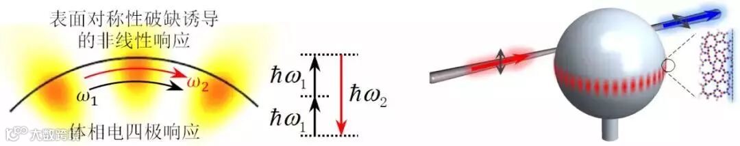 图1 左图:表面二次谐波效应示意图;右图:光学微腔增强表面非线性效应。