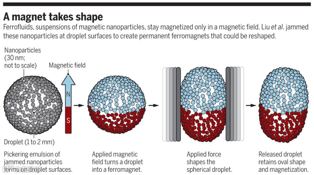 磁性材料的广泛使用大大提升了人类的生活水平,小到家用电器如冰箱,大到航天设备如磁导航仪,固态磁性材料的身影无处不在。而一般液态磁性材料,如传统铁磁流体,虽具有灵活形态但本身不存在磁极,只有在外加磁场作用下被持续磁化才能表现出特定磁性。
