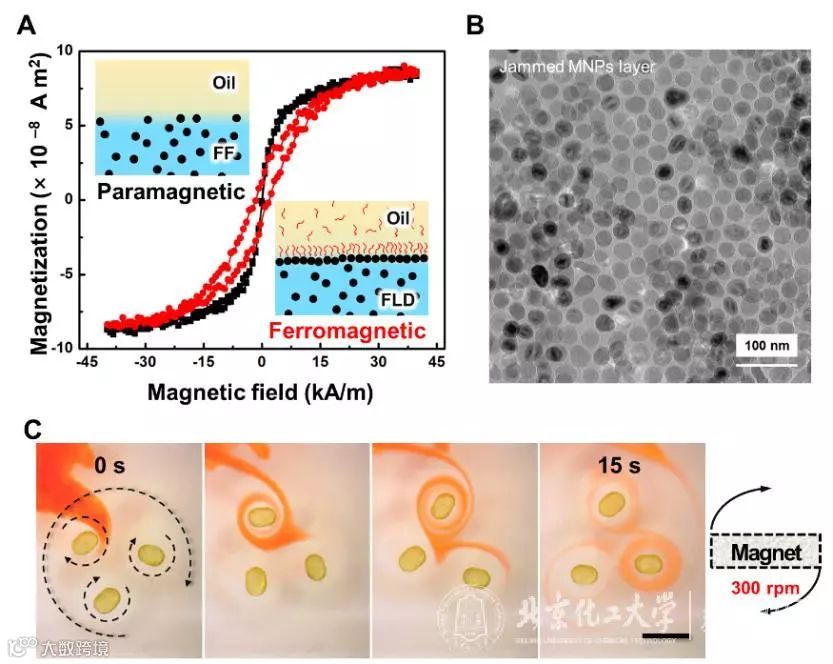 (C)悬浮在油相中的铁磁液滴在外部磁场作用下旋转,红色染料记录了液滴周围液体的湍流轨迹。