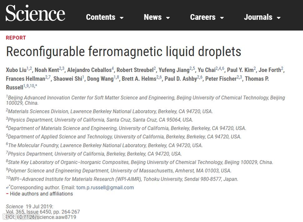 Xubo Liu, Thomas P. Russell et al. Reconfigurableferromagnetic liquid droplets. Science 2019, 365, 264-267.