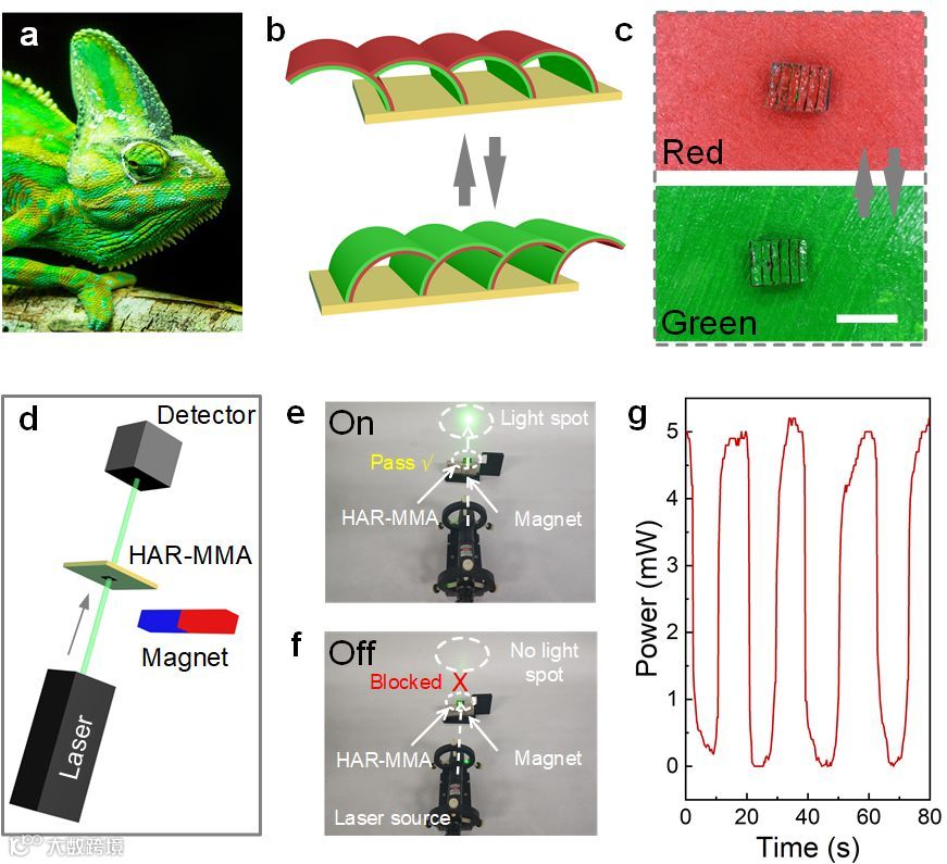 图4. (a)-(c)磁控微板阵列结构实现可控表面颜色切换。(d)磁控微板阵列用于光学光闸应用。(e)光穿过处于开启状态的光闸。(f)光被处于关闭状态的光闸阻挡。(g)光闸的连续可逆开启-关闭控制。
