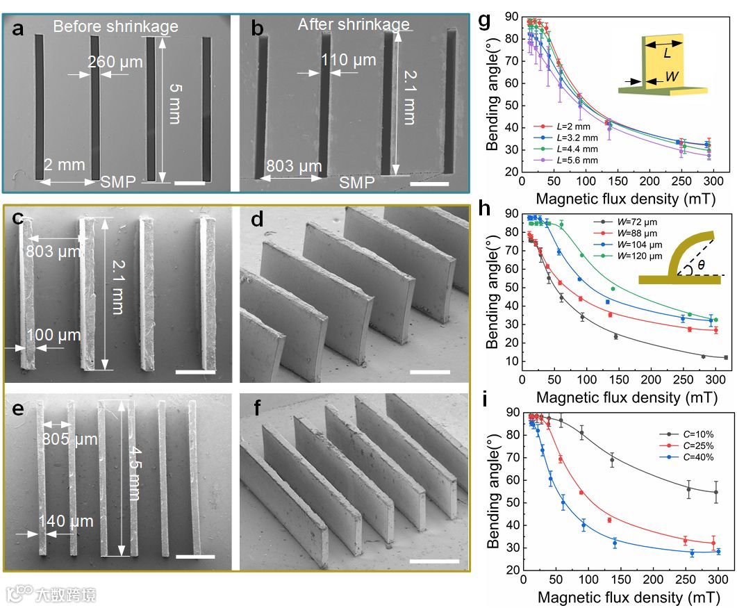 图2. (a)-(b)收缩前后的微孔电镜图。(c)-(f)不同长宽参数的微板阵列电镜图。(g)-(i)不同长度、宽度、铁粉浓度下微板弯曲角度与磁场强度的关系。