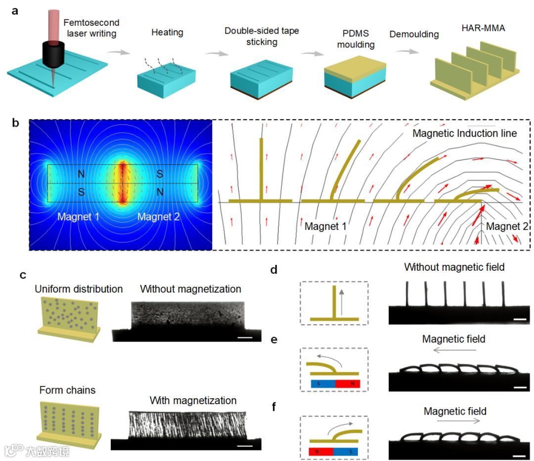 图1. (a)高深宽比磁响应微板阵列的制备过程。(b)磁场仿真及磁响应微板阵列沿磁场方向弯曲。(c)固化前无磁化的微板与固化前磁化的微板。(d)-(f)磁响应微板结构在不同方向磁场作用下弯曲。