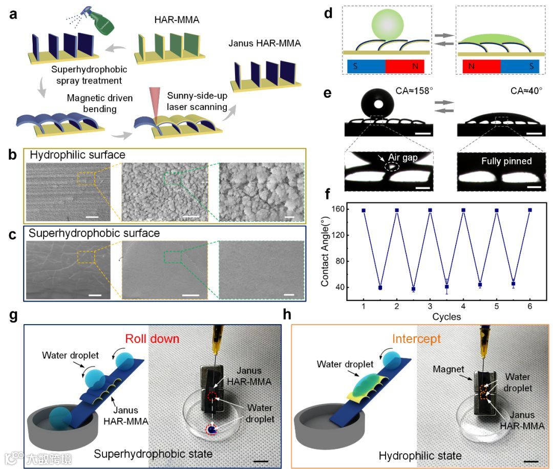 图3. (a)可控润湿性“双面神”结构的制备。(b)激光处理后的亲水表面电镜图。(c)超疏水表面电镜图。(d),(e)“双面神”微板阵列结构的可控润湿性。(f)水滴接触角的多次可逆转换。(g),(h)超疏水与亲水状态下水滴“开关”的开启与关闭状态。