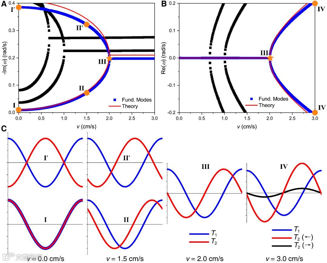 对于图1C, D中的系统,温度场演化的本征值和本征态都可以直接理论计算得到。结果显示系统在不同的背景速度v下表现出两个不同的相。在低速下,系统受APT对称保护,本征值为负的纯虚数,对应本征态在空间中保持静止。当v超过一个临界速度之后,系统发生APT对称破缺,本征值出现非零的实部,对应本征态在空间中移动。这些预测得到了二维数值模拟的证实。对图1C中的二维系统左右施加周期性边界条件后,有限元模拟得到的本征值和理论结果相符,相变发生的奇异点(exceptional point)位置基本吻合(图2A, B)。模拟获得的本征态温度分布也符合理论解,观察可见随着速度的增大,在对称相中两个温度场都保持静止,但之间形成了逐渐接近π/2的相位差(图2C中I, I’, II, II’)。在对称破缺相中,不论如何选取规范,至少存在一个温度场其正向和反向波解的大小不同,也就必然存在温度场的整体移动(图2C中IV)。