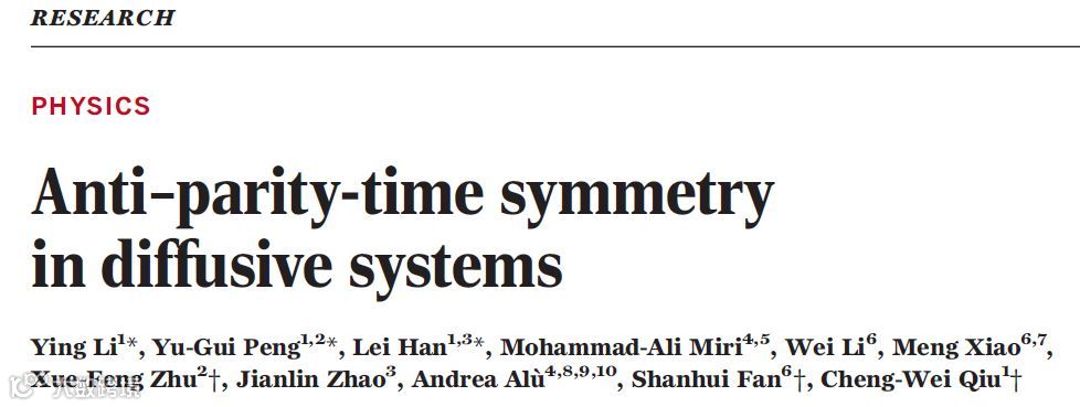 非厄密(non-Hermitian)物理在对与环境间存在能量交换的开放系统的研究中取得了丰富的进展。具有宇称-时间(parity-time)对称或反宇称-时间(anti-parity-time)对称的电磁波和声波展现了一系列新奇现象。然而,此前对这类对称性的认识都根深蒂固地局限在波物理领域中,没有意识到可能存在其他的物理框架。2019年4月,新加坡国立大学 C.-W. Qiu组、华中科技大学祝雪丰组、斯坦福大学Shanhui Fan组在Science 上发表了题为 “Anti–parity-time symmetry in diffusive systems” 的论文,成功在波动系统外预言并观测到了传热中的反宇称-时间对称,展现了一个全新的非厄密物理研究平台。