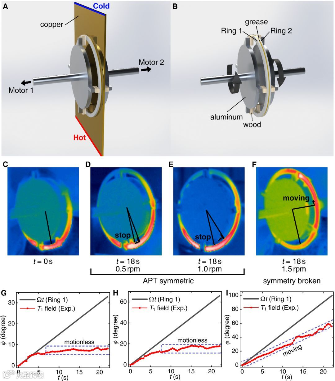 本文设计的APT对称系统只需要用低廉的日常材料在传统机械平台上即可构造完成。如图4A所示,两个塑料制的圆环连接在两个低速电机上,圆环之间涂了一层润滑膏。可以先使它们接触一个上端冷、下端热的铜板从而获得初始温度梯度。此后撤掉铜板,使圆环隔着润滑膏相互靠拢对齐,再开启电机即实现了图3中所模拟的相同过程。观察图4C–F中由红外热成像仪拍摄到的温度场,以及图4G–I中由这些温度场计算出的温度梯度朝向(基于与电偶极子相似的计算方法,称为温度偶极子朝向),可以再次验证理论所预测的相变现象。
