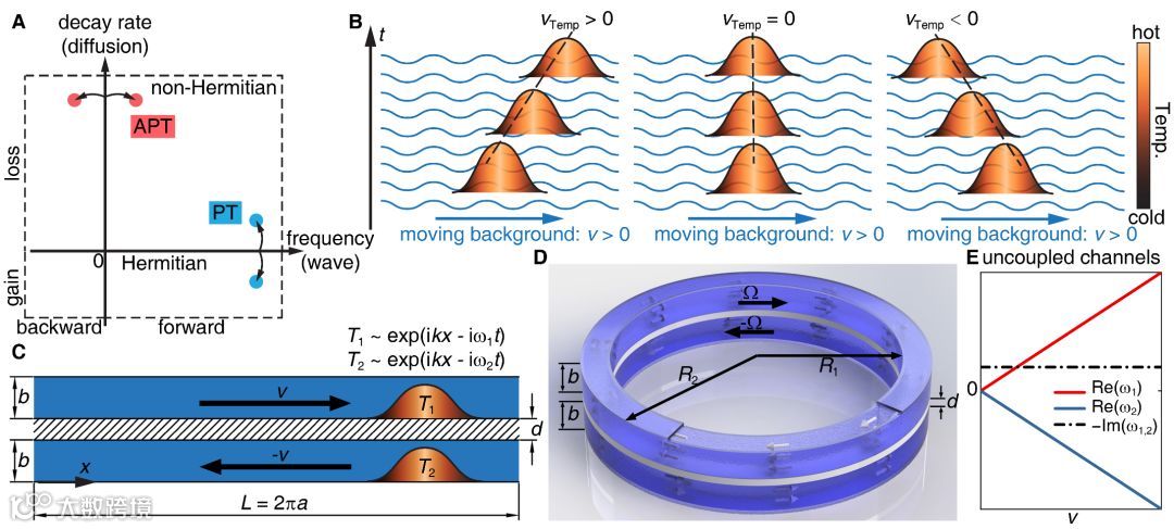 热传导是固体中的基本传热形式,满足扩散方程。如果用等效哈密顿量描述其温度场演化的话,可以发现其本征值是一个纯虚数,本征频率为零。热对流则是移动物质中的基本传热形式。根据常识,温度场往往跟随着移动的背景做整体移动(图1B左),因此我们才可以用风扇带走热量实现降温。通过分析这一过程对应的对流-扩散方程可以发现,这种整体移动的效应实际上给原本是纯耗散的系统演化引入了振荡效应或非零的特征频率。因此,对流传热系统天然就符合上述第二种研究非厄密物理的路径,其中的对流项和扩散项分别对应哈密顿量中的厄密和非厄密部分。基于这个新认识,PT对称相关的概念也可以找到实际的物理对应,只不过我们会发现在传热中哈密顿量在PT算符映射下会改变符号,也即满足APT对称。有趣的是,在APT传热系统中,温度场不但可能表现出常见的随背景移动效果,也能在移动背景中保持静止(图1B中),甚至反向于背景移动(图1B右)。