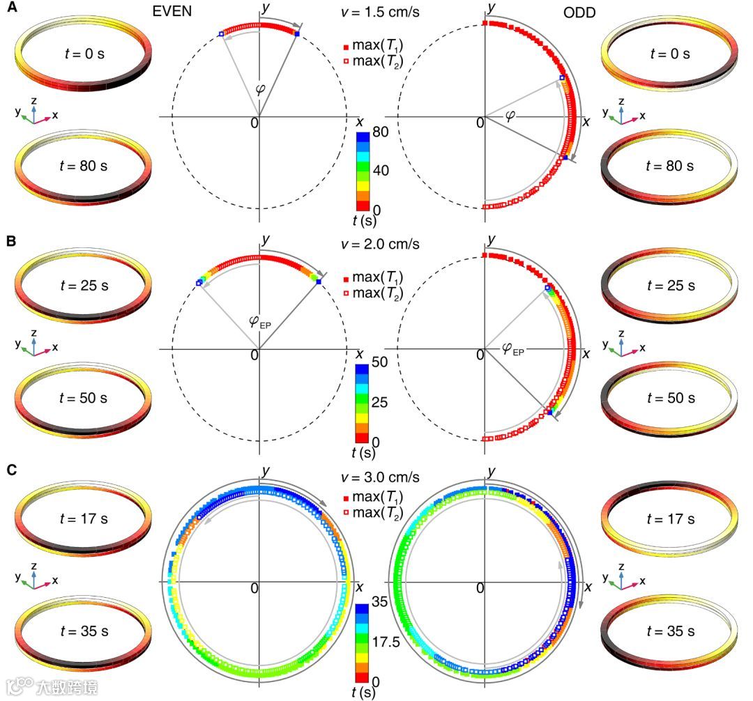 图4. 实验实现APT对称系统。A 给系统施加竖直方向的初始温度梯度;B 进行实验;C–F 测量得到的环1上温度分布;G–I 温度偶极子朝向的演化