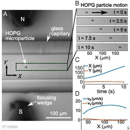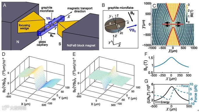 然而反磁性微粒可以在远离磁场的地方遵循严格的最小磁场路径,并且可以被限制在静态的三维磁场中。另一个优点是,其感应磁矩几乎与粒子形状无关,大大简化了磁势能、力和转矩的量化。近期来自伦敦大学学院(University College London)的Isabel Llorente Garcia教授研究了无标签的抗磁性石墨微片在无流体流动的情况下的磁控输运。