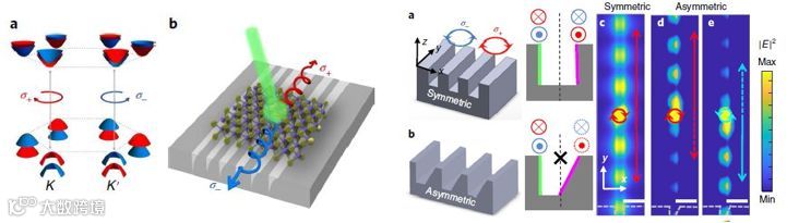 近日,来自美国德克萨斯奥斯汀分校的Xiaoqin Li教授及其联合团队,通过将单层MoS2与亚波长不对称凹槽阵列构成的等离子体超表面相耦合,实现了谷极化激子在室温下的空间分离。除了在实空间中分离谷激子之外,谷激子的发射和分离也能够在光子动量空间中实现; 也就是说,光子的螺旋性决定了优先发射方向。这项工作表明,超表面可以促进谷电子输送,并在谷电子和光子器件之间建立接口,从而为谷电子学领域打开了新的大门。