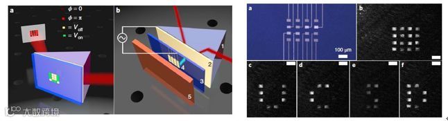 在自由空间中调控光学波前并产生结构光束,是光子学的一个重要的研究课题。结构光束的产生往往是通过空间光调制器来实现。空间光调制器(SLM)是一类对在自由空间中传播的光束施加空间变化幅度和/或相位调制的装置。目前,商用设备主要是基于液晶和数字化微振镜技术,其调制速度仅限于千赫兹量级。为了实现更高的运行速度,需要新技术和新方法的应用。近日,来自美国加利福尼亚州拉霍亚大学的Yeshaiahu Fainman教授及其团队报道了一种新的方法。他们开发了一种可编程等离子体相位调制器,这种空间光调制器基于表面等离子体和电光响应材料之间的近场相互作用,能够以1GHz的调制速度作用于波长为1,550nm的自由空间光场。具有高二阶非线性和三阶非线性系数的氮化铝或富硅氮化硅的电介质薄膜是可编程等离子体相位调制器(PPPM)阵列中的有源层。PPPM利用线性和二次电光效应来实现薄膜有源层的快速、空间分辨的折射率调制。利用这种方法,研究团队实现了4×4像素的空间光调制。通过偏振对比成像进行空间结构光调制的可视化验证演示,利用可编程化的等离子体相位调制器拼出了“UCSD”的字母。