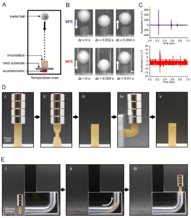 (a)冲击试验台示意图。(b)KF样品在30℃和90℃冲击载荷期间的延时图像。比例尺为3 mm。(c)在30 ℃和90 ℃下在基板上测量的加速度。(d)可重构微晶格。i)样品处于其原始形状并承受载荷;i i)样品编程为不同的几何结构并承受相同的载荷;i i i)加热后样品返回其原始形状;i v)将样品重新编程为弯曲形状并仍承受相同的载荷;v)加热后样品再次返回其原始形状。比例尺为5 mm。(e)可展开的KF微晶格。i)将原始形状的样品(总厚度大于通道内径)放置在左室中并承受荷载,i i)将样品编程为直径较小并通过弯曲通道导航至右室,i i i)样品从通道中出来并重新获得右舱承载能力。比例尺为20mm。