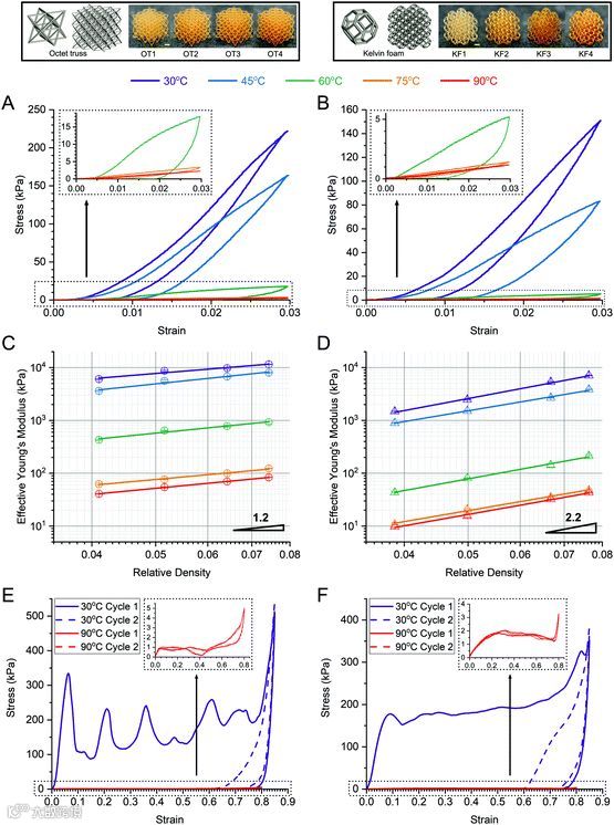 (a)OT4和(b)KF4在五个温度下的应力-应变曲线。对数尺度上(c)OT和(d)KF微格的有效杨氏模量与相对密度的关系。OT和KF的模量从30℃显著下降到90℃。在所有温度下,OT的比例因子为1.2的线性关系和kf的比例因子为2.2的二次关系保持不变。(e)OT2和(f)KF2在30 ℃和90 ℃下连续两次压缩循环的应力应变曲线。微格顶部图像中的比例尺为2mm。