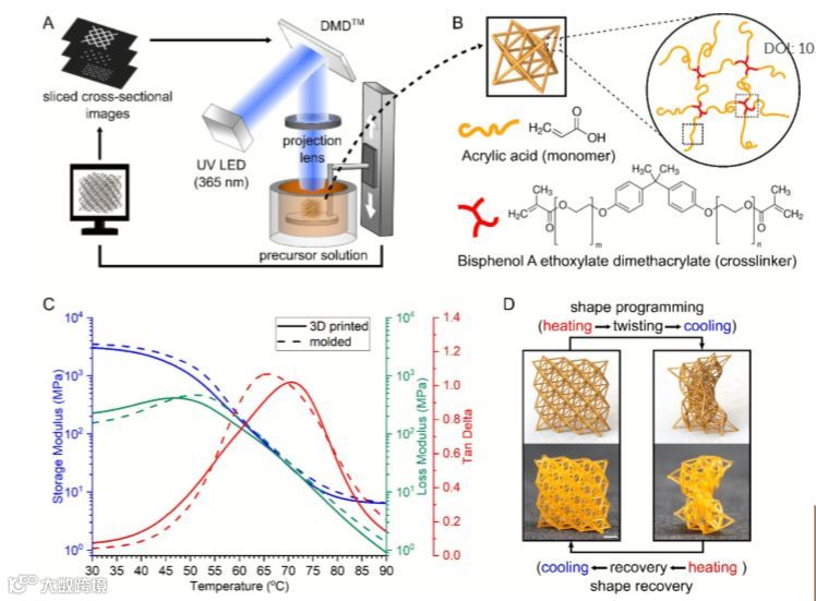 (a)数字添加剂制造工艺示意图。(b)光固化形状记忆聚合物(SMP),由丙烯酸(AA)作为单体形成链段,双酚A乙氧基二甲基丙烯酸酯(BPA)作为交联剂形成交联节点。(c)SMP的存储模量、损耗模量和tanδ。(d)SMP微晶格的典型形状记忆循环。通过加热、变形和冷却进行形状编程,加热后形状恢复到原来的形状。比例尺为2mm。