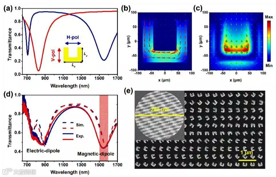 SRR环在水平偏振入射下1550nm波长的(b)电流密度和(c)磁场分布;